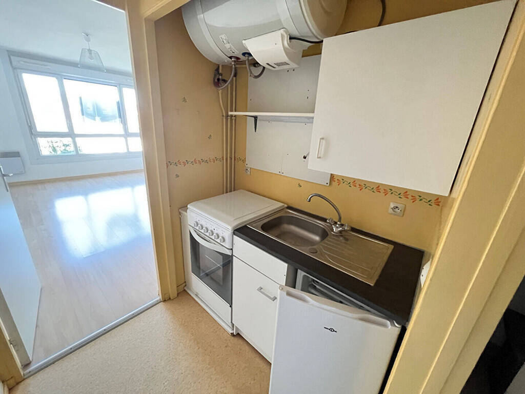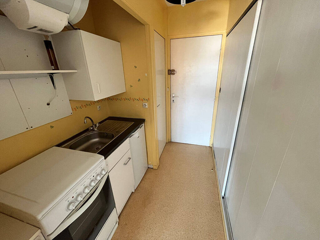 Situé au 4e étage d'une résidence calme et sécurisée - Studio de 27.44 m² offrant un hall d'entrée avec grand placard et cuisine équipée (Four, plaques, réfrigérateur, rangements), un séjour lumineux, une salle de bains baignoire et WC.