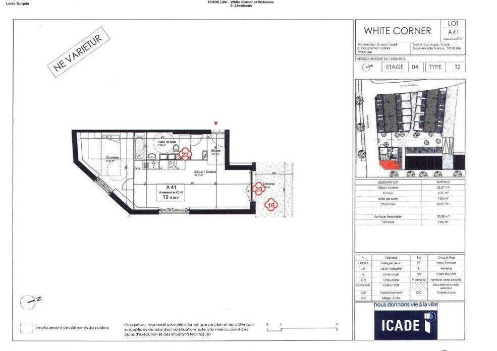 Lille Sud, rue du faubourg d'arras, A louer appartement type 2 de 50m² offrant un hall d'entrée, un séjour avec cuisine ouverte équipée, accès a une terrasse de 10m², une chambre, une salle de bains avec WC-