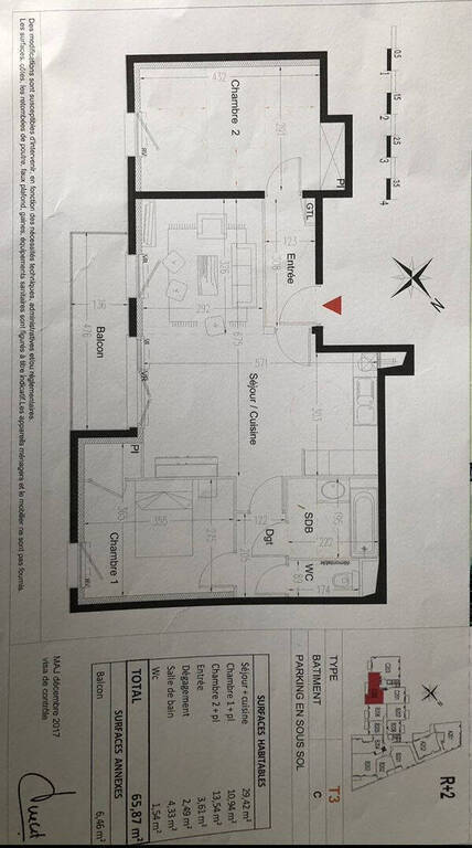 Il comprend un séjour de 29.42m² avec une cuisine équipée (meubles de rangement, plaques, four, hotte) , deux belles chambres avec placards de 10.94 m² et 13.54 m².