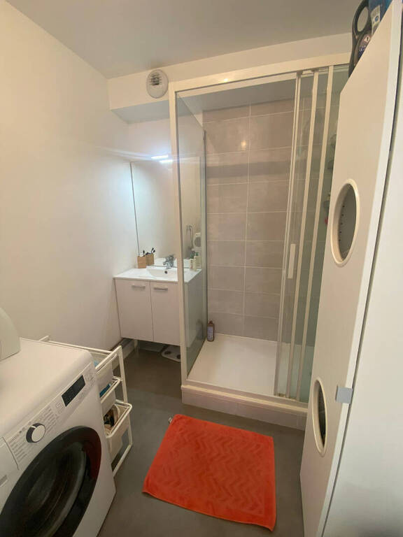 Une salle d'eau (meuble vasque, douche) un balcon et une place de parking en sous-sol