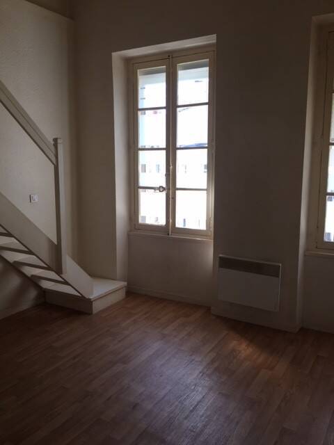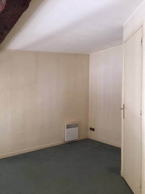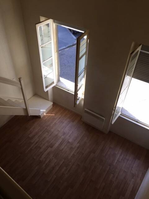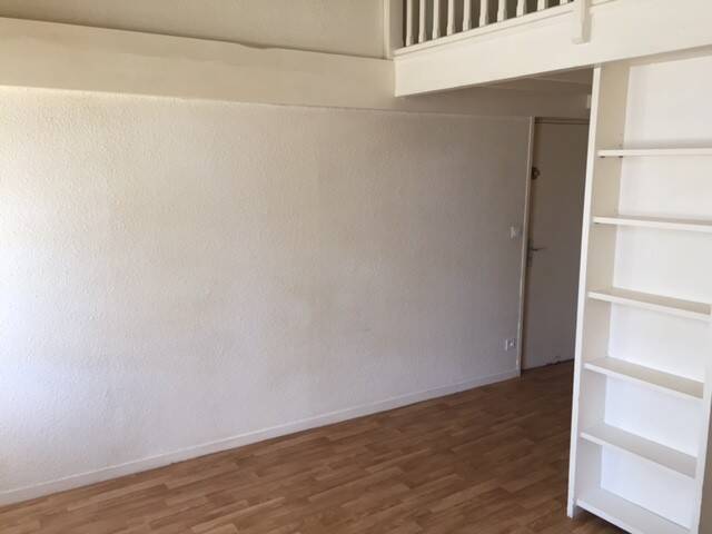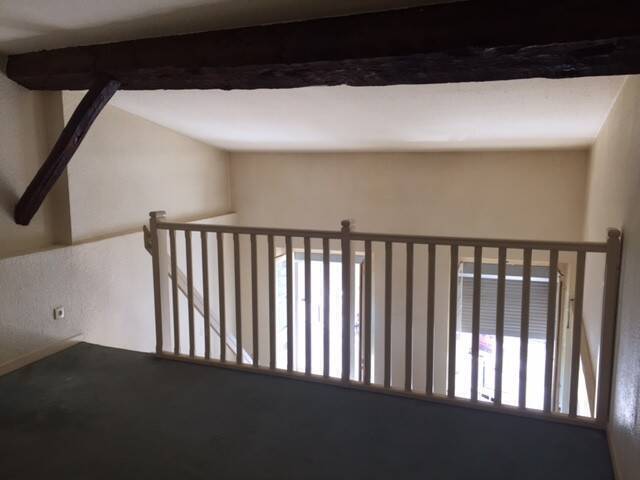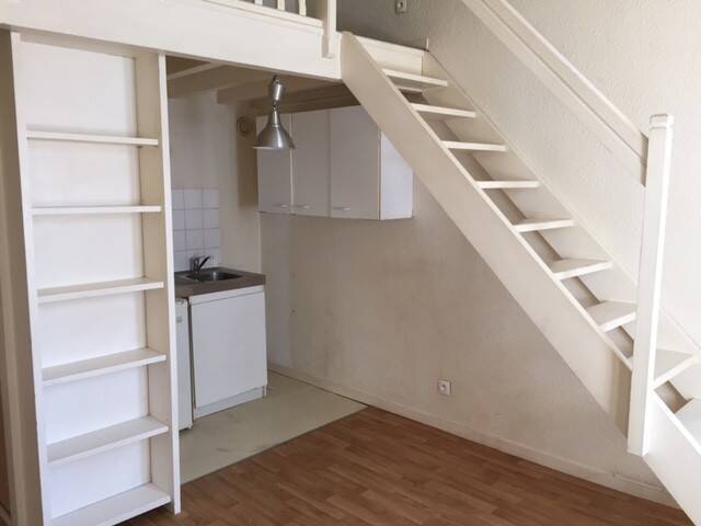 Un T1 au 1er étage d'un immeuble en pierre comprenant une entrée, une pièce principale avec une mezzanine, une kitchenette, une salle de bains et des toilettes séparées.